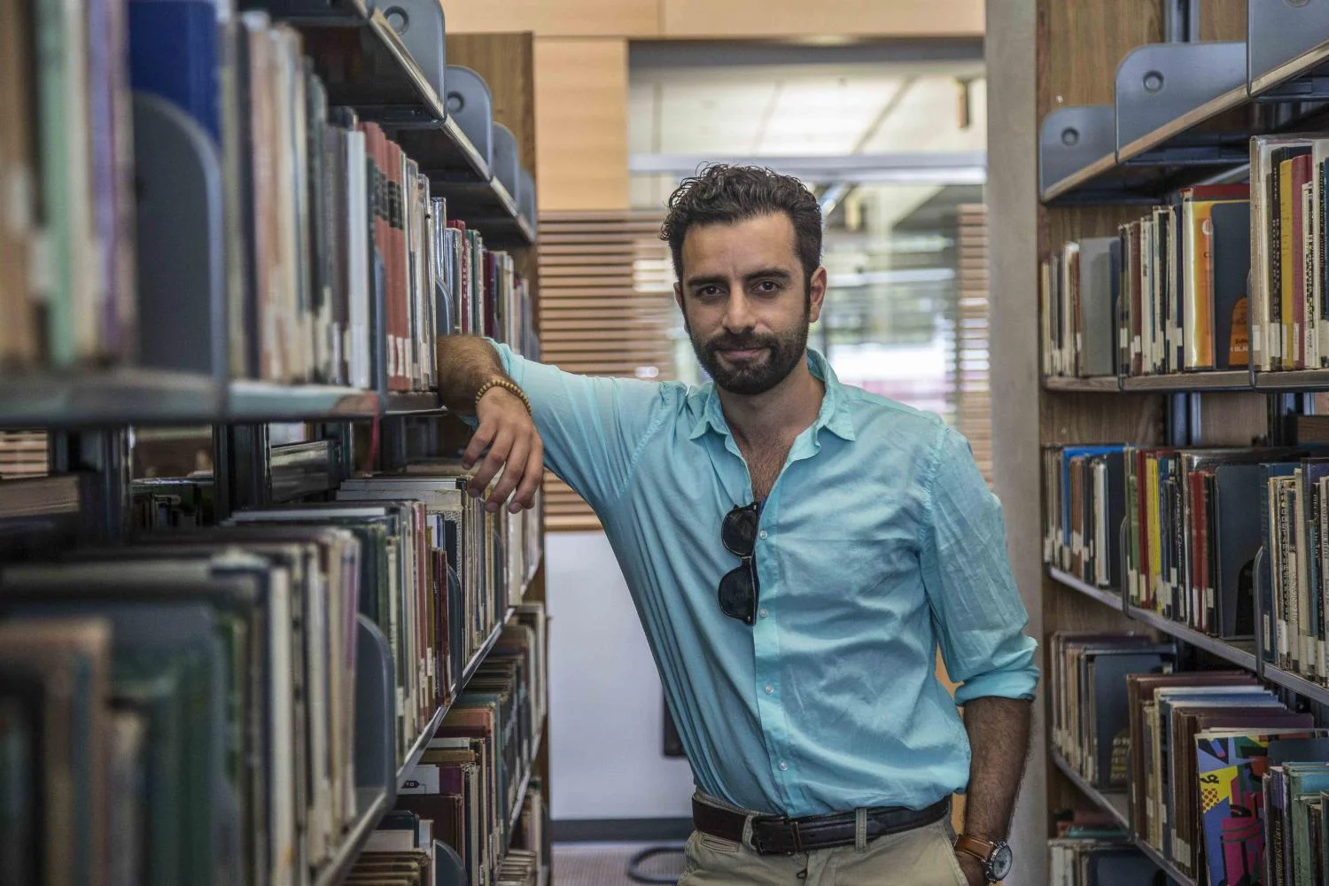Arsi Nami, an award winning musician, an actor, music therapist and Santa Monica College alumni, walks the halls of the SMC library where he would spend a majority of his time as a SMC student. Nami was an international student at Santa Monica Community College, graduating from SMC with an Associates degree in music, where he would go on to California State University to receive his Bachelors degree in music therapy. At the Santa Monica College Library in Santa Monica California, on Thursday, April 27 2017. Matthew Martin.