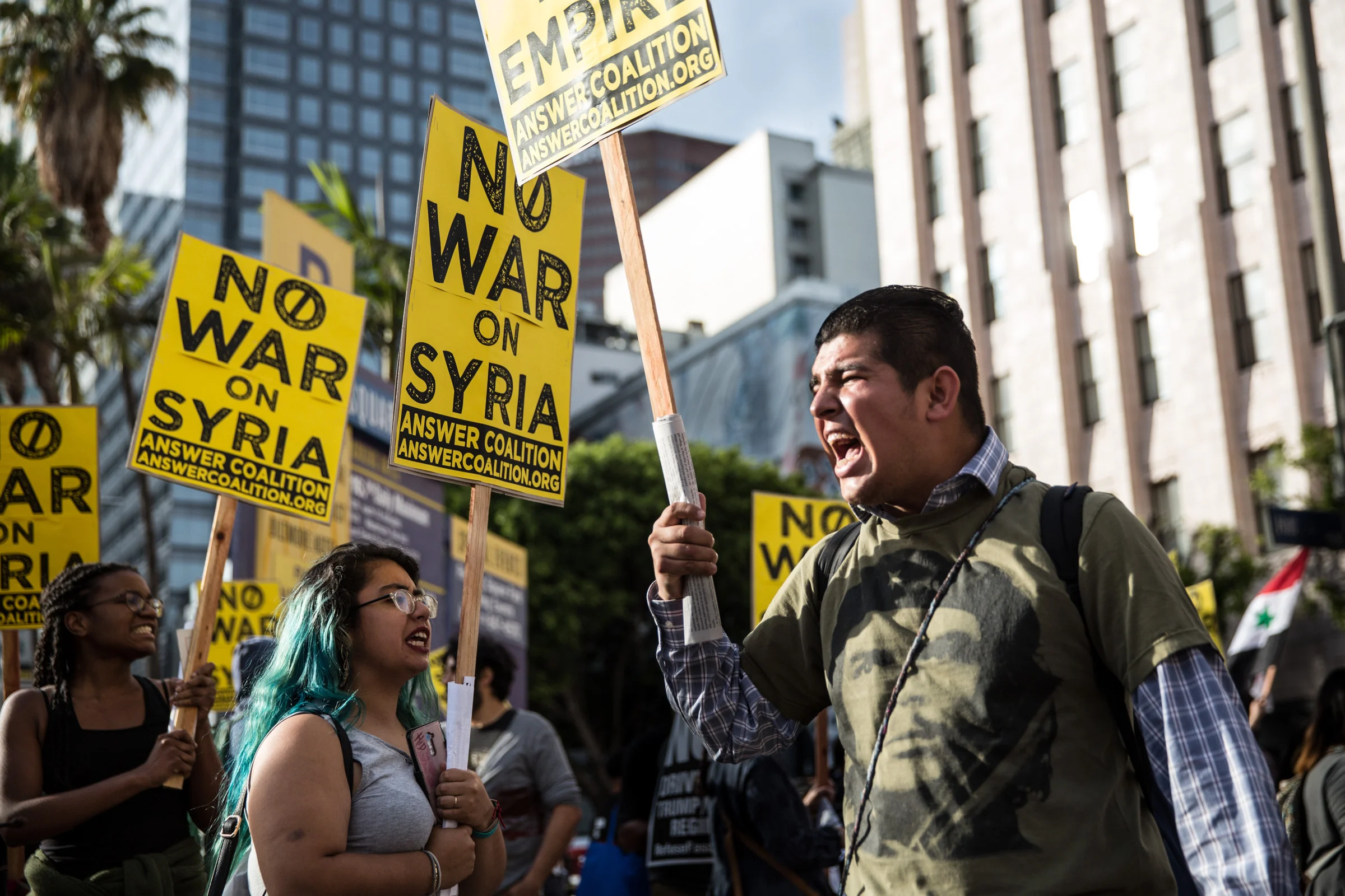 On Friday, April 7, groups of protesters gathered in downtown Los Angeles to demonstrate against the United States’ recent preemptive strike against Syria. The attack, which occurred the night before, saw some 59 cruise missiles strike a Syrian air force base near the city of Homs.
